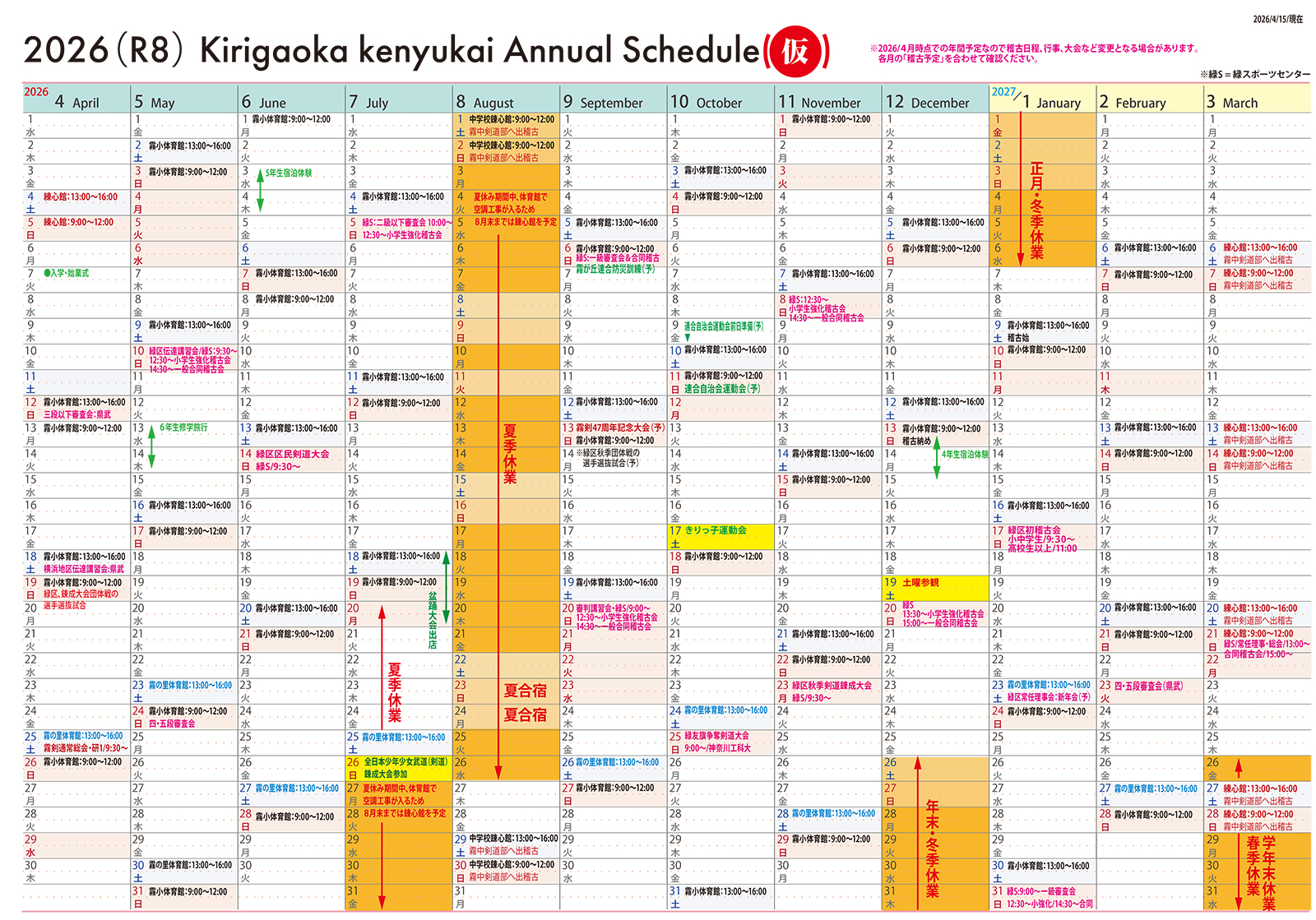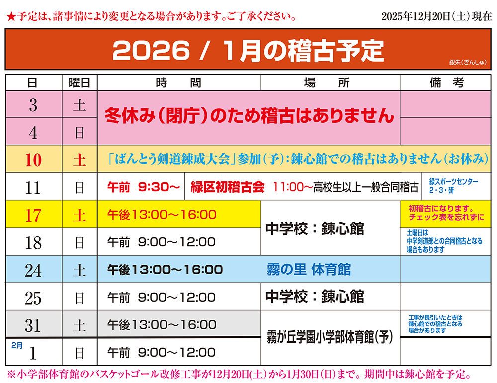 ※稽古時間は余儀なく変更される場合があります。変更の場合は連絡網でお知らせいたします。