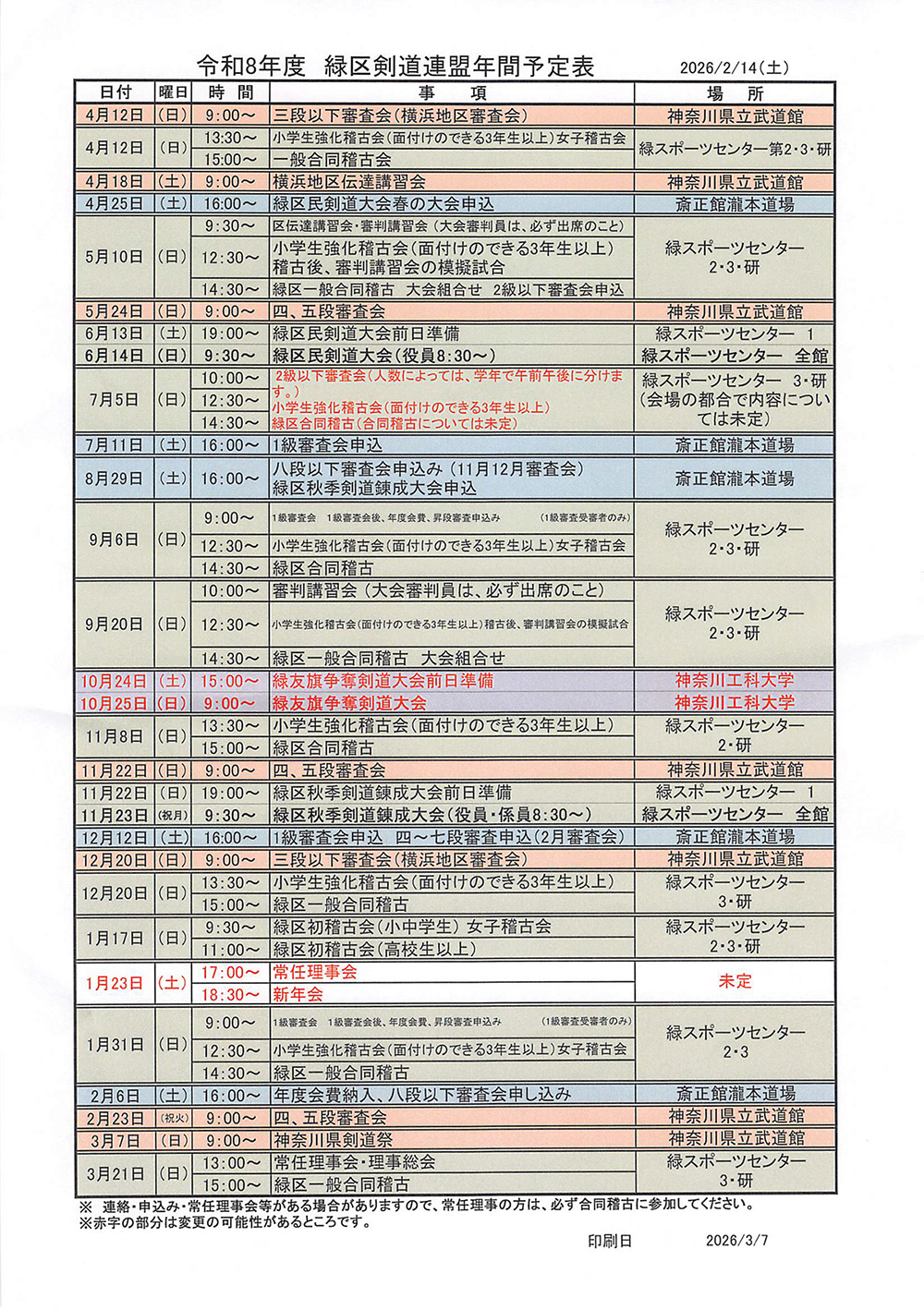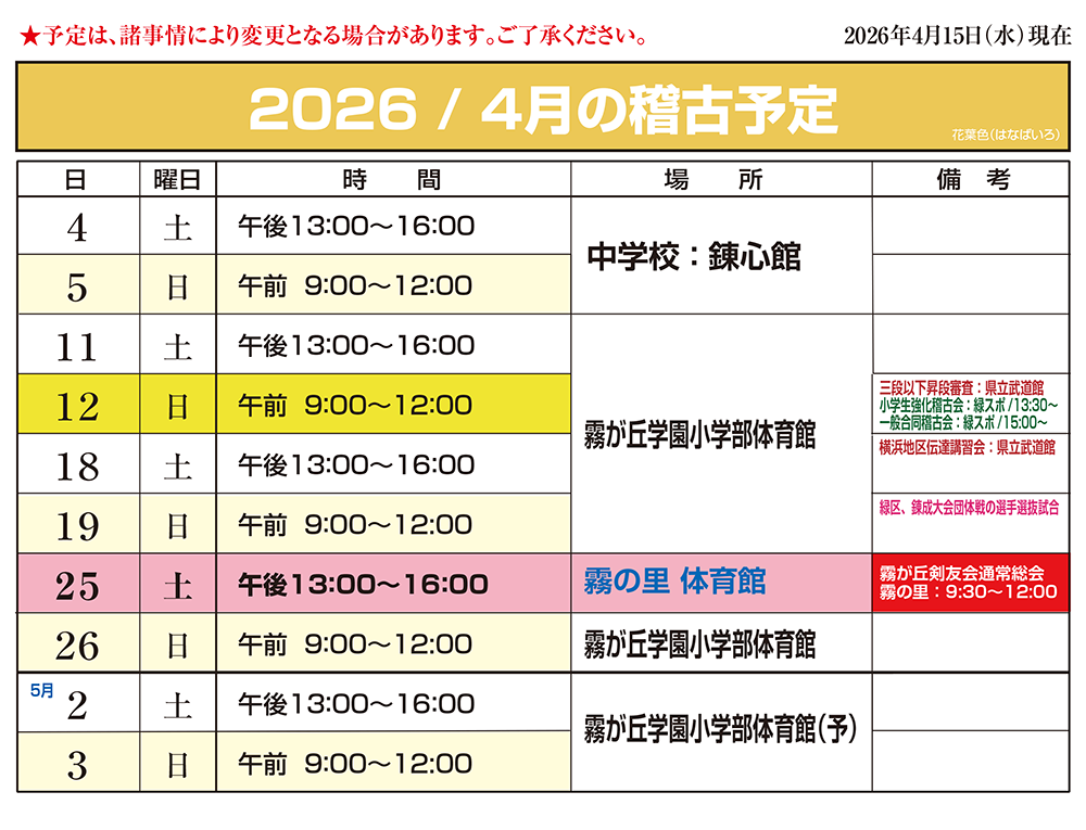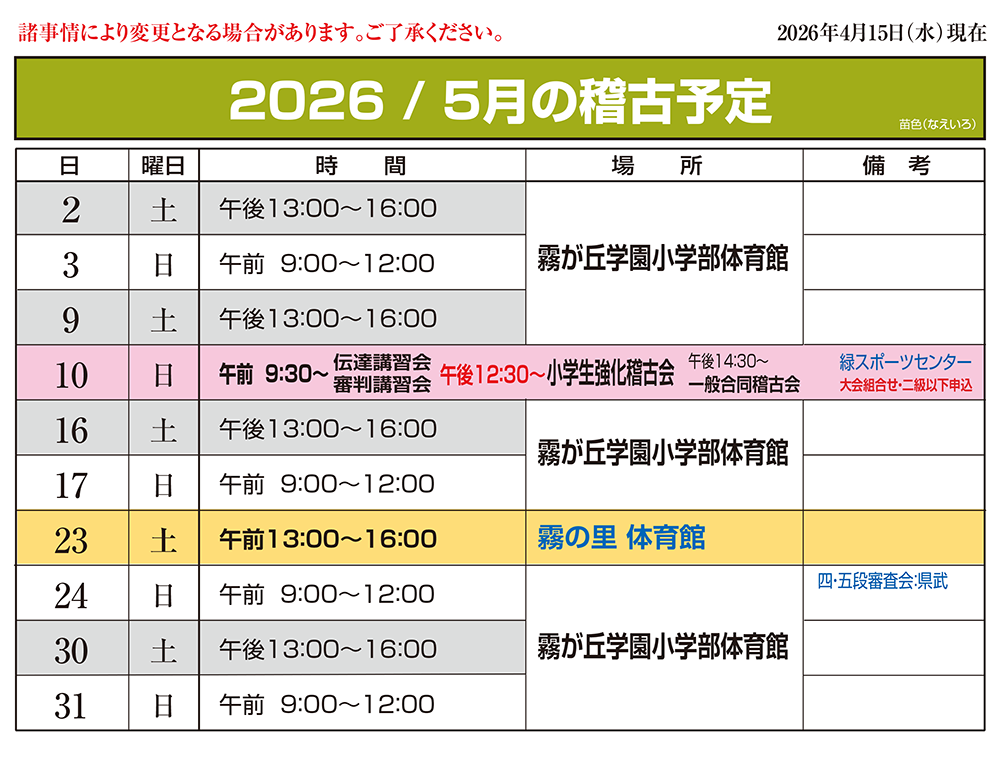 今月の稽古予定This month's practice schedule